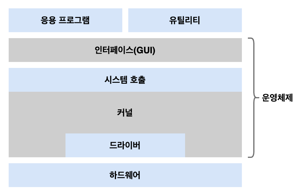 사용자 영역: 애플리케이션을 이용하기 위하여 마련된 공간으로 인터페이스(GUI)가 해당커널 영역: 사용자가 이용하는 하드웨어를 효율적이고 안전하게 사용하기 위해 마련된 공간으로 시스템 호출, 커널, 드라이버가 해당- 운영체제에 속하는 영역은 크게 사용자 영역과 커널 영역으로 나뉨
