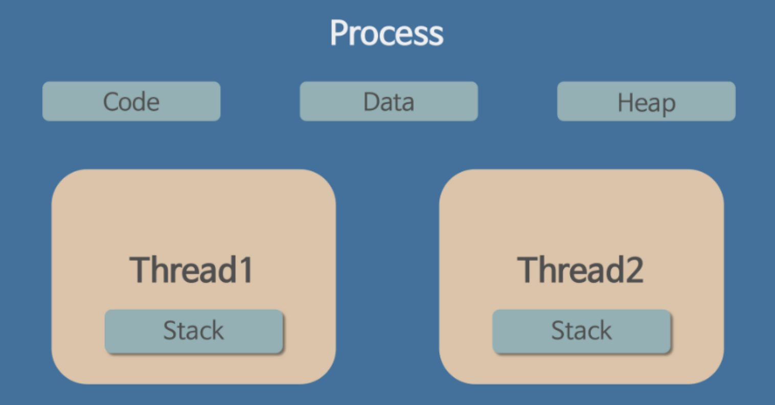 - 스레드는 프로세스 내에서 각각 Stack만 따로 할당받고 Code, Data, Heap 영역은 공유함