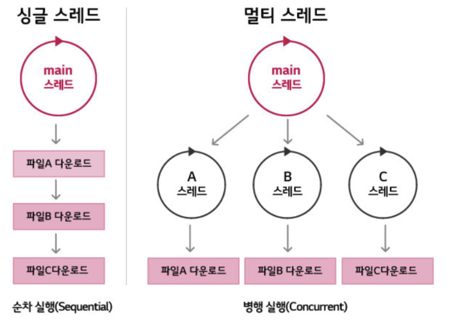 - 기본적으로 프로세스당 최소 1개의 스레드(메인 스레드)를 가지고 있음