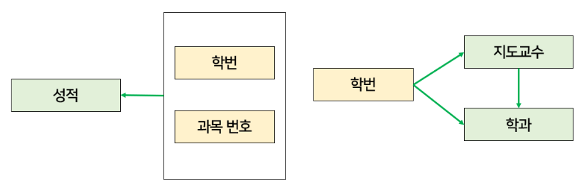 - 부분 함수 종속 : 기본키를 구성하는 속성의 일부에 종속되거나, 기본키가 아닌 다른 속성에 종속되는 경우