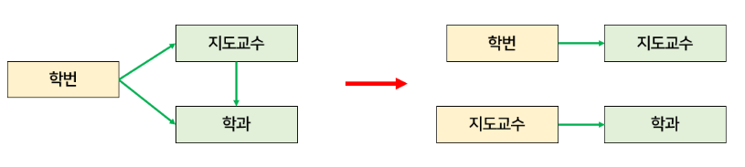 → 위 그림처럼 각 속성들이 모두 완전 함수 종속이 되도록 릴레이션을 분리시켜줌