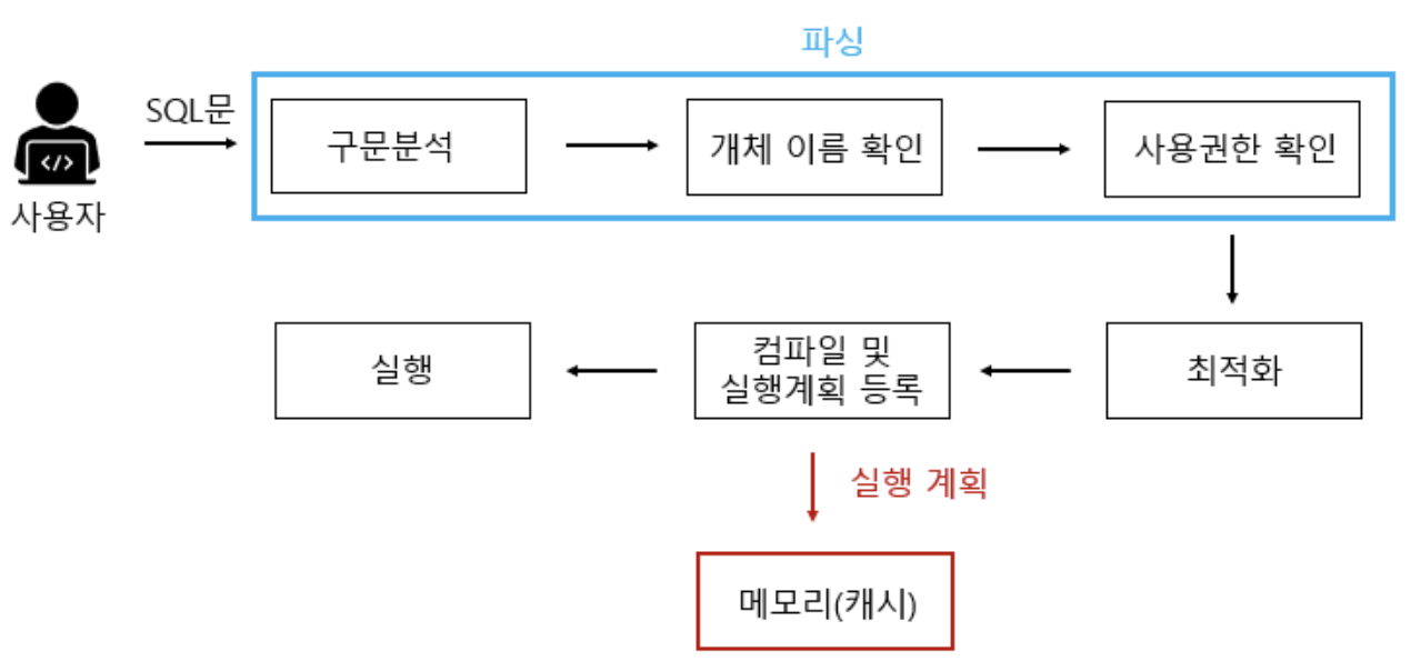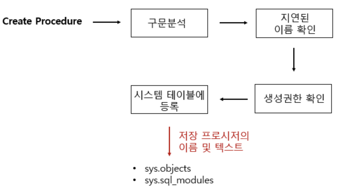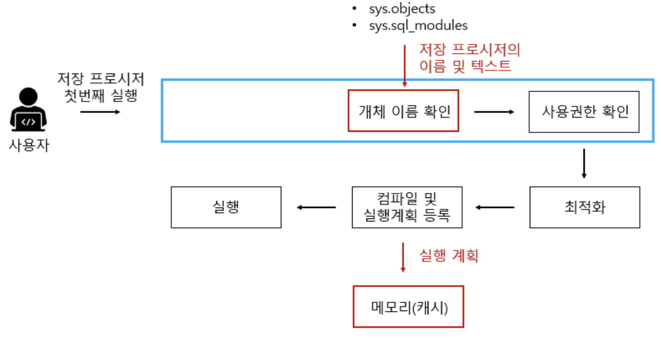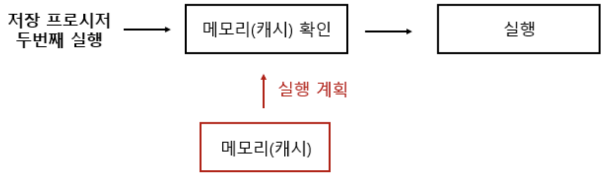 - → 저장 프로시저를 처음에 실행하면 최적화, 컴파일 단계를 거쳐 그 결과가 캐시에 저장되게 되는데, 이후에 해당 SP를 실행하게 되면 캐시에 있는 것을 가져와 사용하므로 실행 속도가 빨라지게 됨