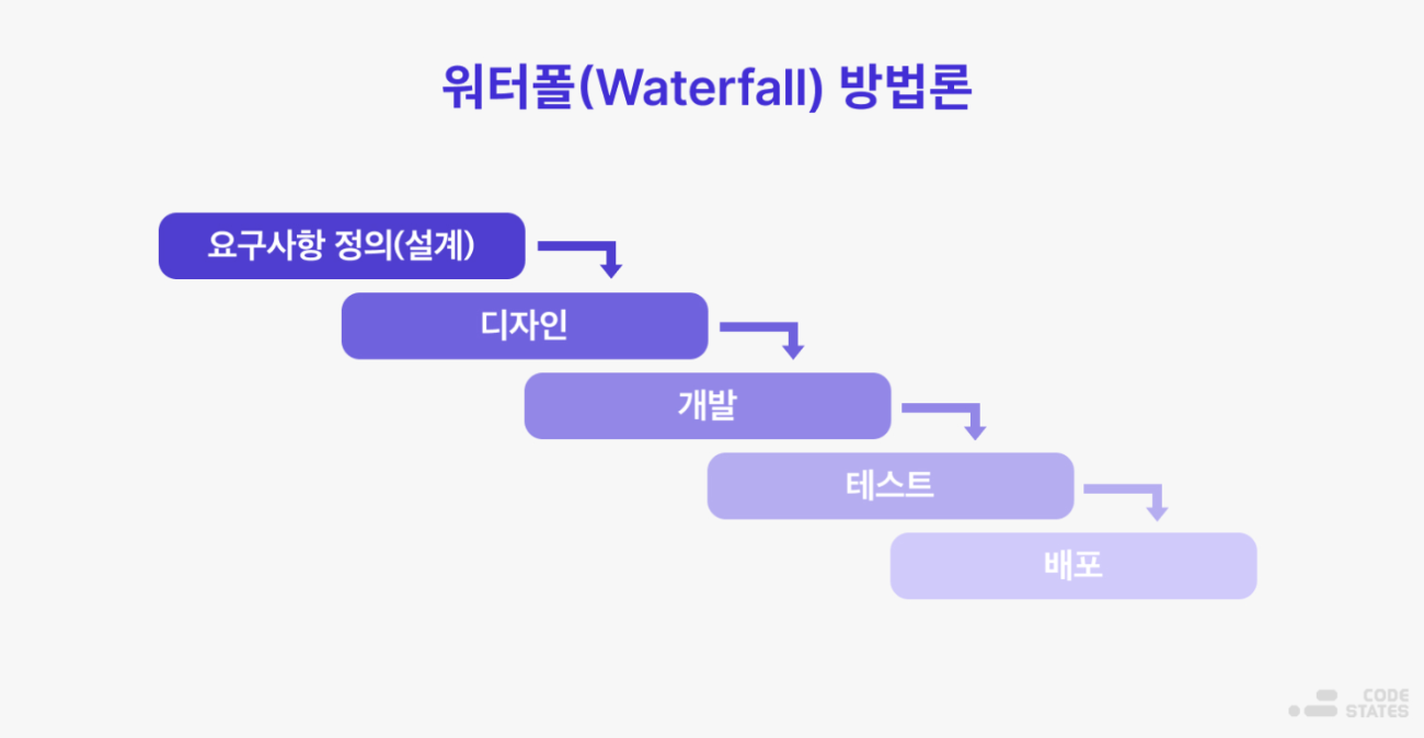 : 각 작업이 폭포처럼 위에서 아래로 떨어지는 단계별 개발 방법론