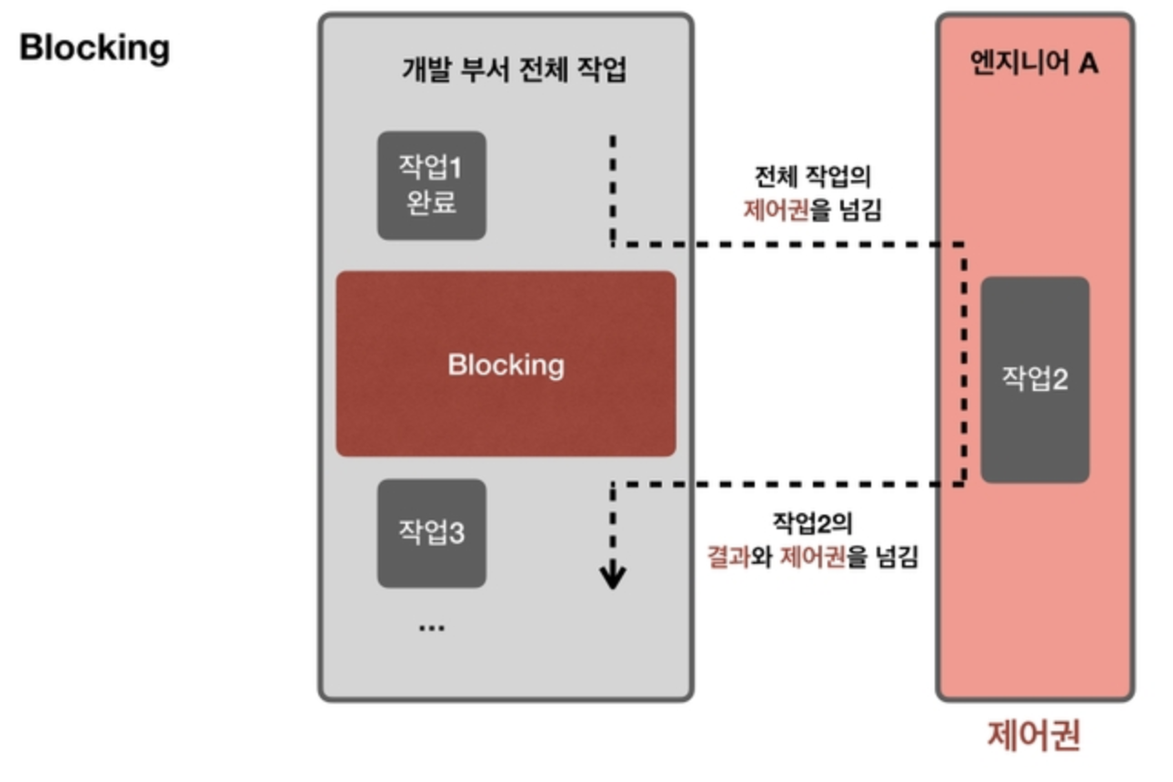 - 호출하는 함수는 호출되는 함수의 작업 완료 여부 또는 작업 완료 후 리턴을 기다리고 있음