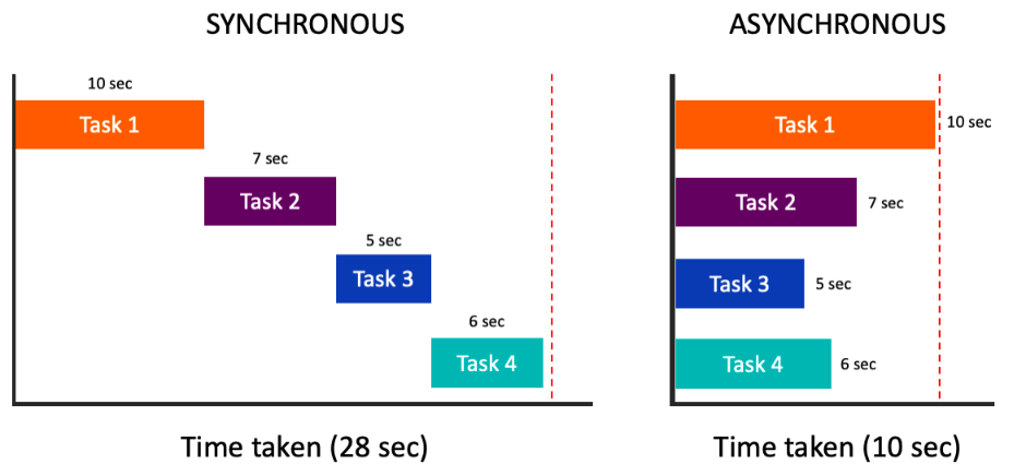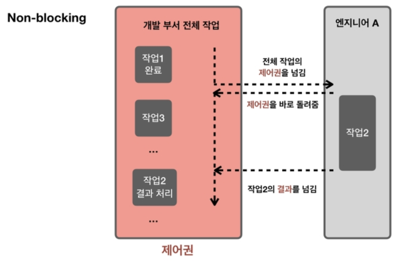 - 호출된 함수는 호출되면 바로 리턴⇒ 호출한 함수는 호출 이후 제어권을 바로 받기 때문에 작업을 계속하면서, 호출했던 함수의 작업 완료는 주기적으로 확인