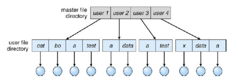 - ์ค์์ Master File Directory(MFD)๊ฐ ์กด์ฌํ๊ณ , ๊ทธ ์๋์ ๊ฐ user๋ณ๋ก ์๋ก ๋ค๋ฅธ User File Directory(UFD)๊ฐ ์กด์ฌ